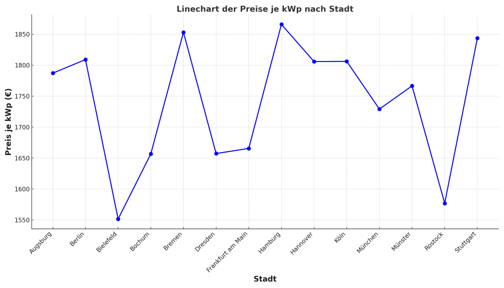 Die Kosten für eine Solaranlage werden in der Regel pro installiertem Kilowattpeak (kWp) angegeben. Der Kilowattpeak ist die Leistung, die eine Solaranlage unter optimalen Bedingungen erbringen kann. Die durchschnittlichen Preise für eine installierte Leistung von 1 kWp liegen in den betrachteten Städten zwischen 1.551,34 € in Bielefeld und 1.865,95 € in Hamburg.